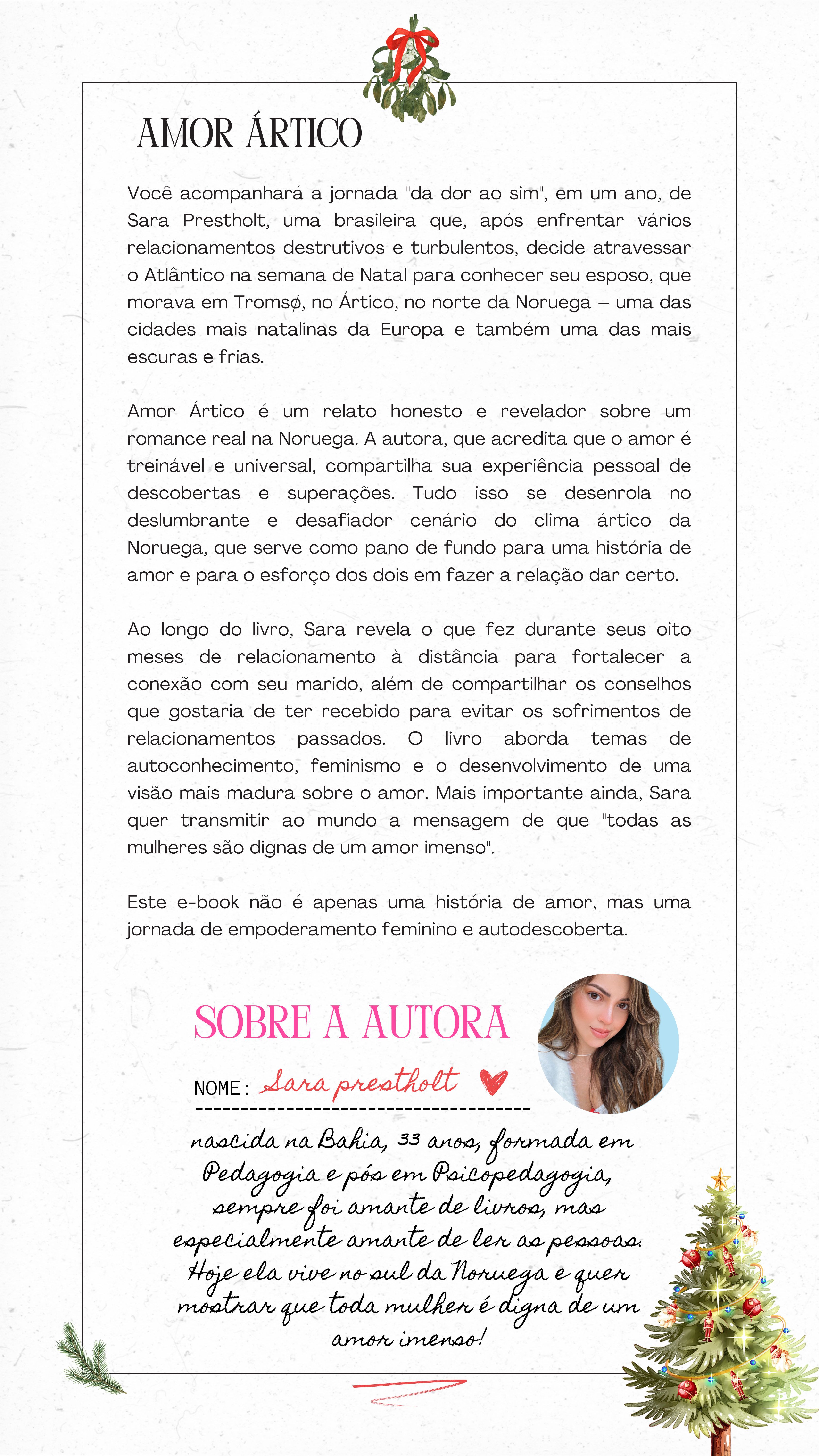 Li Amor Ártico e me apaixonei! A história é linda, real e cheia de momentos que fazem a gente refletir sobre a visão do amor. Super recomendo para quem busca uma leitura leve!